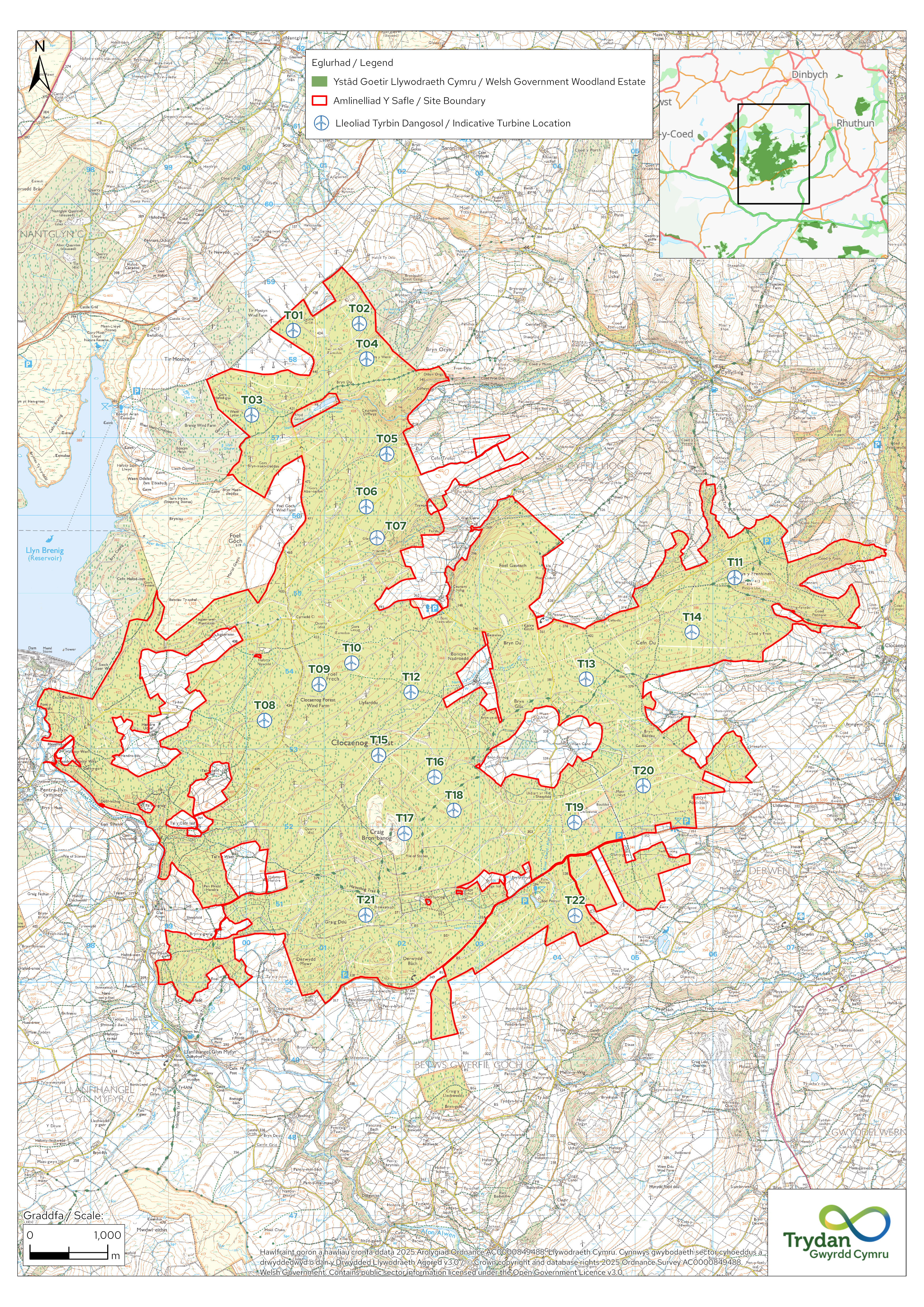 Trydan Gwyrdd Cymru (Trydan), is Wales’ renewable energy developer wholly owned by the Welsh Government. We are investigating the potential for new wind farms with battery energy storage within a number of Welsh Government Woodland Estate blocks, including Cloceanog Forest. Located approximately 8km south-west of Ruthin, the site lies within Denbighshire and Conwy County Borough counties.